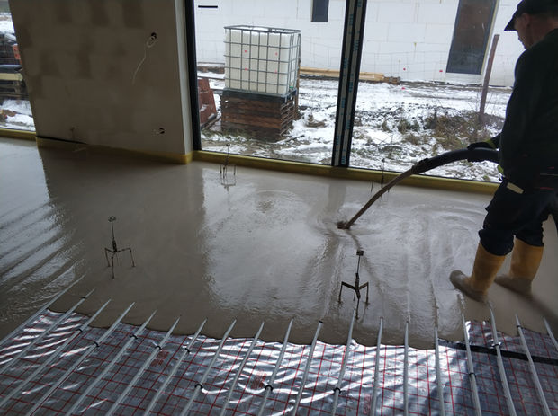 Anhydryt dostarczamy na budowę w postaci płynnej, dzięki płynnym właściwościom masz pewność że posadzka będzie idealnie przylegać do instalacji ogrzewania podłogowego czyniąc jednocześnie podłogę idealnie prostą i gładką. Anhydryt jest niepodatny na błędy w aplikacji, dzięki płynnej konsystencji otrzymujesz doskonałą powierzchnię do montażu płytek, parkietu, paneli podłogowych lub mikrocementu.